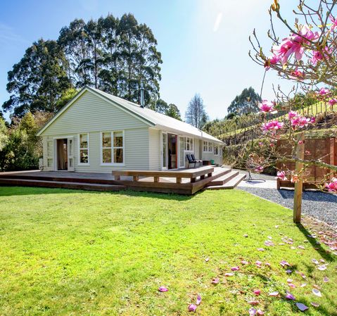 Set on over 3.6 acres of rolling land and flat lawn, the property is fully fenced with five paddocks. Nestled in a naturally sheltered pocket away from the prevailing winds, the easy-care gardens and beech forest provide a peaceful haven where native birds, hawks, and even deer are regular visitors.